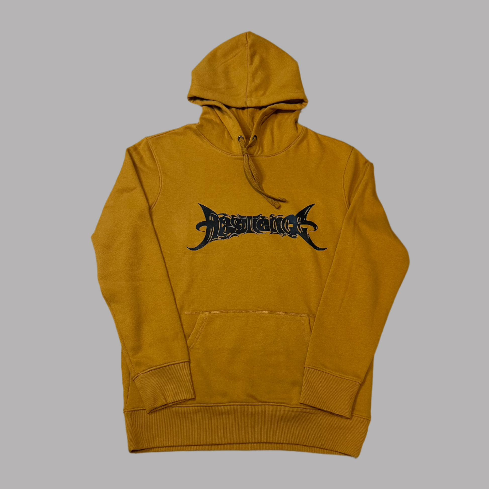A one-of-one hoodie in dark gold, featuring a bold, video game–inspired Resilience print across the chest. Finished with a clean black “R” logo on the back right shoulder. Simple and versatile.