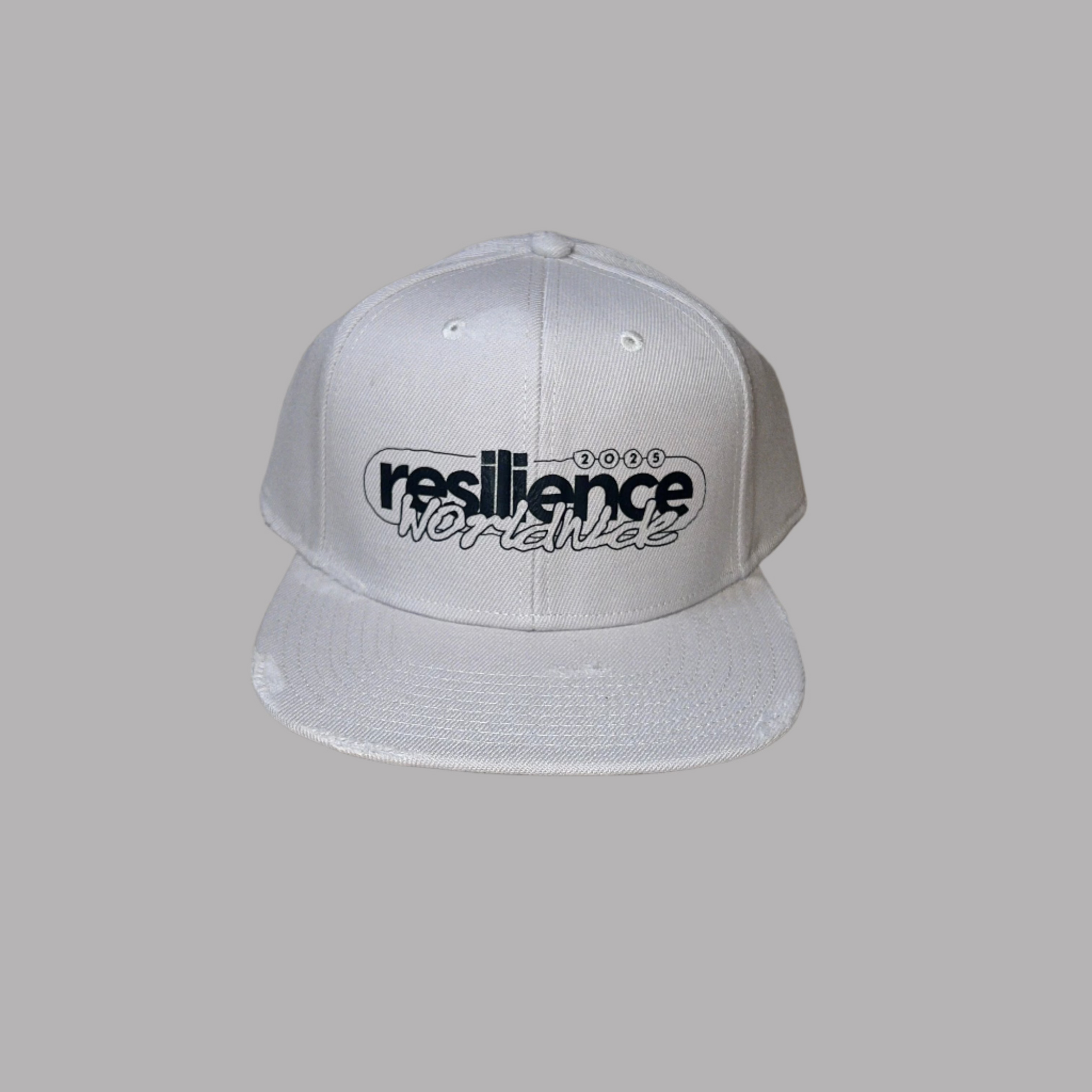 The Resilience: Global Vision 2025 Snapback in cream offers a clean, minimalist aesthetic with a bold statement. Featuring a wide, sideways oval design with the phrase "RESILIENCE WORLDWIDE" and the year "2025" at the top corner, this hat embodies strength and perseverance on a global scale. The design is entirely printed, ensuring a sleek and modern look without any embroidery. A subtle black "R" logo is printed on the back, just above the snap closure.